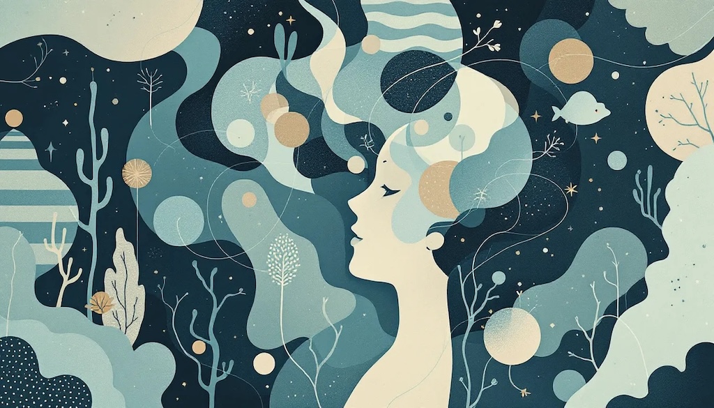 Flat modern illustration in a conceptual mental health style. A clean human silhouette in the center, surrounded by soft abstract icons symbolizing different ADHD stimming behaviors: eye for visual, sound waves for auditory, hand for tactile, flower for olfactory, and circular arrows for movementbased stimming. Minimalist, professional design with calming navy blue, sage green, beige, and offwhite palette. Clean gradients, approachable mental health aesthetic, no text.